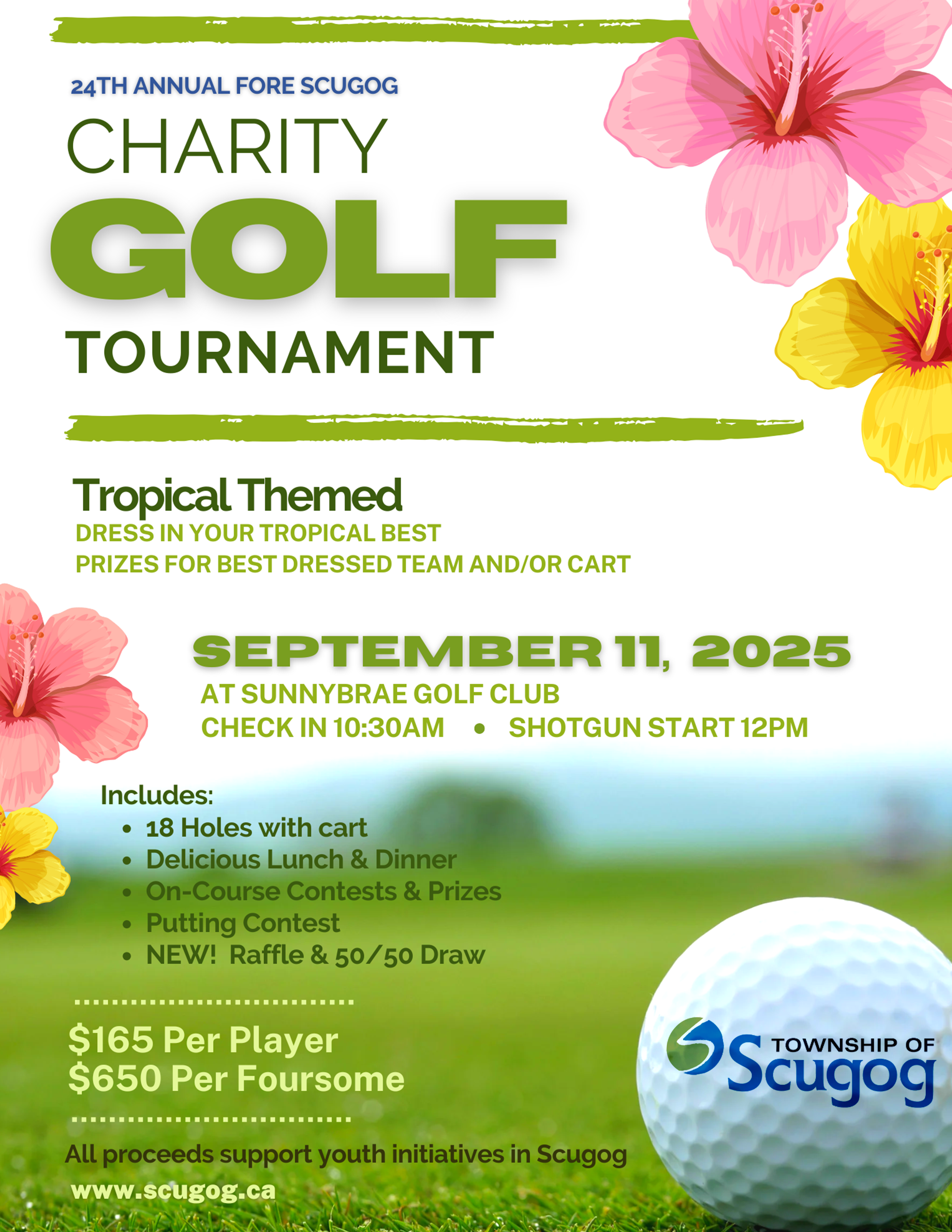 We invite you to join us as the Township of Scugog hosts the 24th Annual Fore Scugog Charity Golf Tournament on Thursday, September 11, 2025!