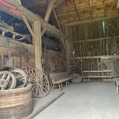 Barns built with squared logs and a gable roof was a common English style barn made in Upper Canada during the mid the late 1800’s. These architectural features are seen the Display Barn and attached Woodwright Shop, which was built in the 1870s in Seagrave. It was deconstructed and rebuilt on the museum grounds in 1987. Barns provided warmth and shelter for livestock, or acted as a storage building.