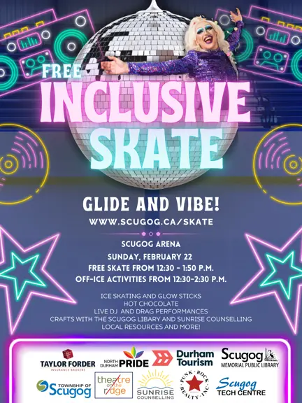The Township of Scugog in partnership with North Durham Pride is excited to bring back a free and inclusive skate this February at the Scugog Arena. Enjoy a fun free public skate with music, activities and local resources promoting inclusivity of the 2SLGBTQI+ community.